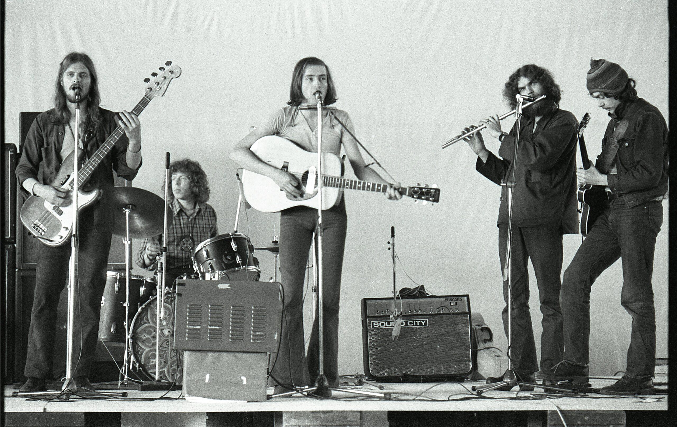 Skousen & Ingemann ved en koncert på Hvidovre Isstadion den 1. maj 1971. Fra venstre ses Peter Ingemann, Bjørn Uglebjerg, Niels Skousen, Knud Bjørnø og Stig Møller. Kun Tømrerclaus mangler. Foto: Susanne Mertz